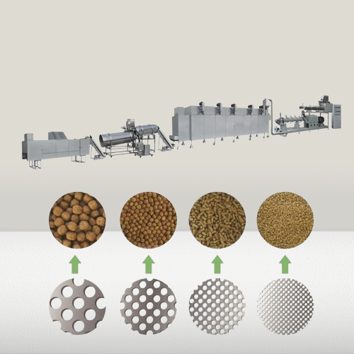 เครื่องผลิตอาหารเม็ดสำหรับสุนัขและแมว สายการผลิตอาหารเม็ดแบบอัตโนมัติ ตัวเครื่องจักรออกแบบมาเพื่อเปลี่ยนวัตถุดิบ เช่น ผัก ผลไม้ เนื้อสัตว์ ปลาป่น มาผสมรวมกันให้กลายเป็นอาหารเม็ดที่มีคุณค่า และมีโภชนาการที่เหมาะสมสำหรับสุนัขและแมว